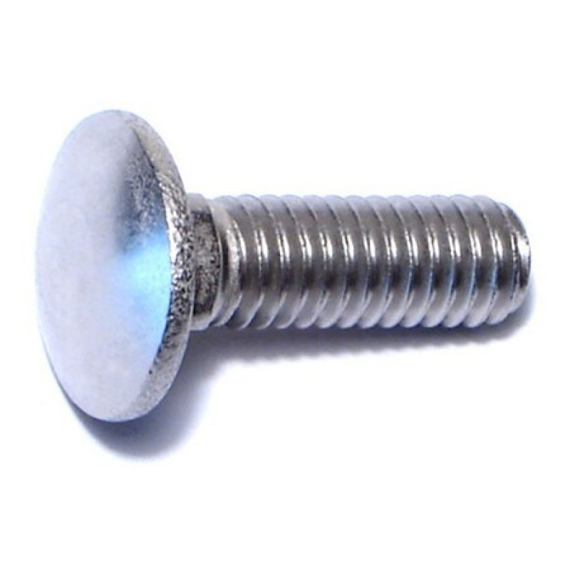 A carriage bolt has a domed or countersunk head, and the shank is topped by a short square section under the head. The square section grips into the part being fixed (typically wood), preventing the bolt from turning when the nut is tightened.
