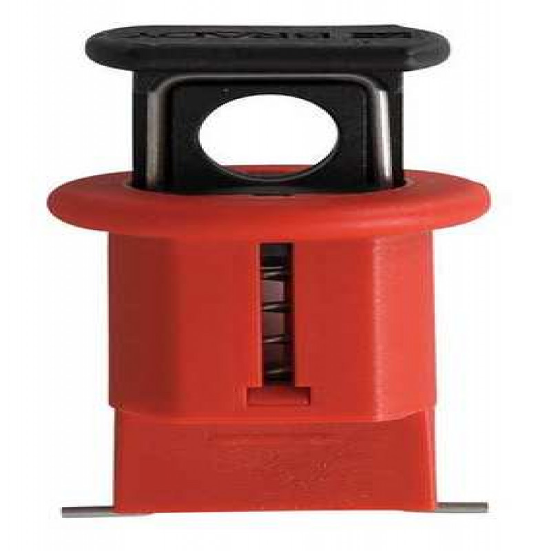 DIN Style Miniature Breaker Lockout, Pin-Out, Wide, Circuit Breaker Voltage 120/277, For Use With European Circuits on Machinery, Max. Number of Padlocks 1, Padlock Shackle Max. Dia. 9/32 in, Red, Height 1 in, Width 1 in, Length 9/16 in, Material Nylon