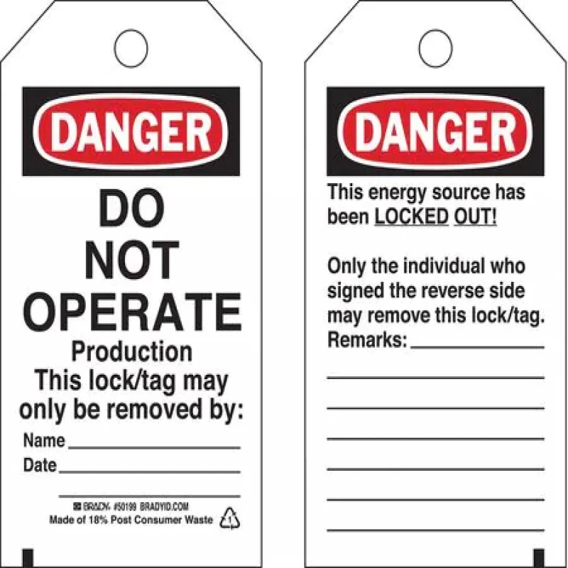 Danger Tag, Material Cardstock, Legend Do Not Operate Production This Lock/Tag May Only Be Removed By, Height 5 3/4 in, Width 3 in, Withstand Pull Force 50 lb, Hole Size 3/8 in, Header Danger, Legend Color Black, Background Color White, Legend Style Text, Write on Surface Yes, Package Quantity 25