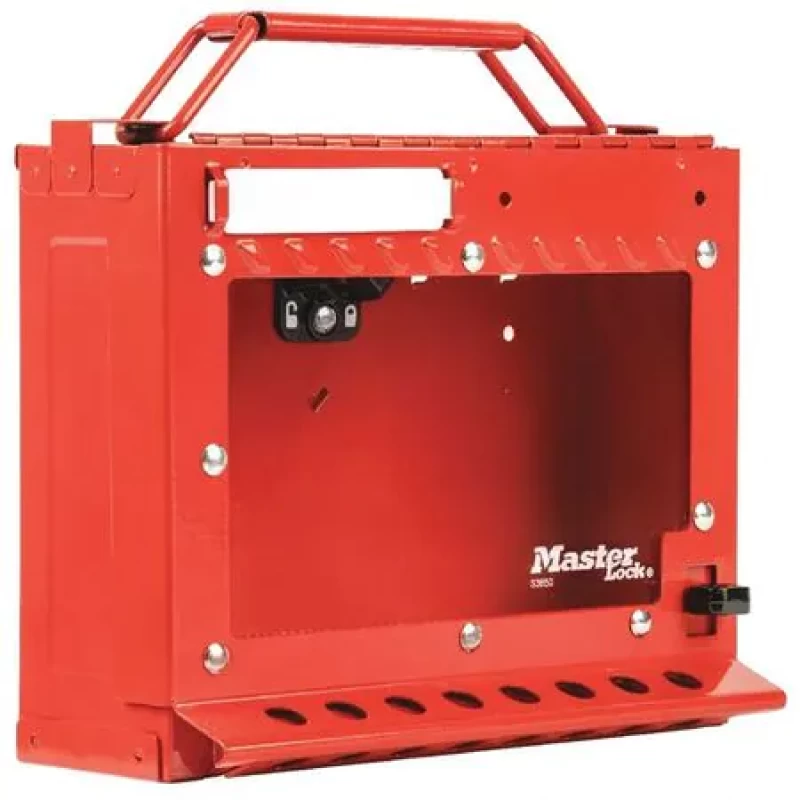 Group Lockout Box, Max. Number of Padlocks 15, Hinged Door Type, Red, Portable Yes, Steel, Height 6 7/8 in, Width 8 3/8 in, Depth 4 in, Wall Mounting Yes, Legend Group Lock Box