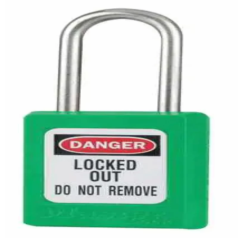 Lockout Padlock, Key Type Alike, Body Material Thermoplastic, Shackle Dia. 3/16 in, Shackle Height 1 1/2 in, Shackle Material Stainless Steel, Shackle Width 5/8 in, Body Width 1 3/8 in, Body Height 1 7/8 in, Body Color Green, Shackle Type Open