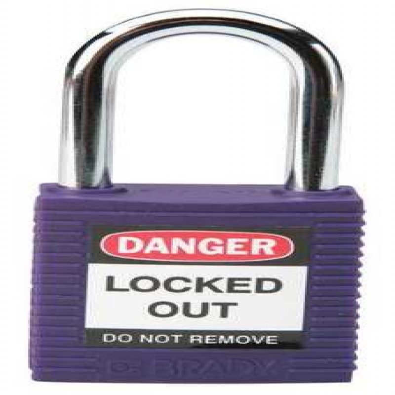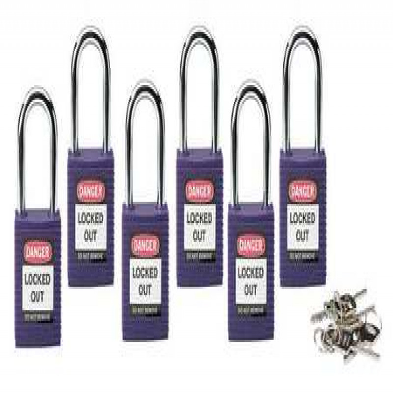 Lockout Padlock, Key Type Alike, Body Material Thermoplastic, Shackle Dia. 1/4 In., Shackle Height 1-1/2 In., Shackle Material Hardened Steel, Shackle Width 3/4 In., Body Width 1-1/2 In., Body Thickness 4/5 In., Includes English, Spanish, French Lockout Labels, Standards OSHA 1910.147, Body Height 1-3/4 In., Body Color Purple, Control Key Registration Required No, Shackle Type Open, Number of Keys 1, Number of Pins 6, Padlock Body Shape Rectangular