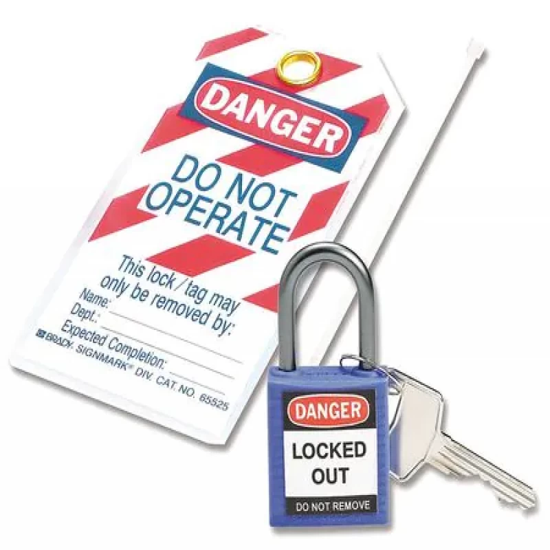 Lockout Padlock, Key Type Different, Body Material Thermoplastic, Shackle Dia. 1/4 in, Shackle Height 1 in, Shackle Material Aluminum, Shackle Width 3/4 in, Body Width 1 1/4 in, Body Thickness 5/8 in, Legend Danger Do Not Operate, Includes Heavy Duty Polyester Lockout Tag, Nylon Cable Tie, Standards OSHA 1910.147, Body Height 1 7/16 in, Body Color Blue, Shackle Type Open