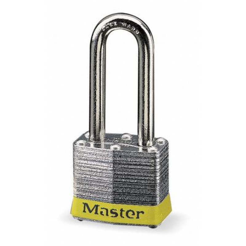 Lockout Padlock, Key Type Different, Body Material Steel, Shackle Dia. 9/32 in, Shackle Height 2 in, Shackle Material Hardened Steel, Shackle Width 5/8 in, Body Width 1 9/16 in, Body Thickness 3/4 in, Body Height 1 1/4 in, Body Finish Laminated, Body Color Yellow, Shackle Type Extended, Bumper Color Yellow, Number of Bumpers 1