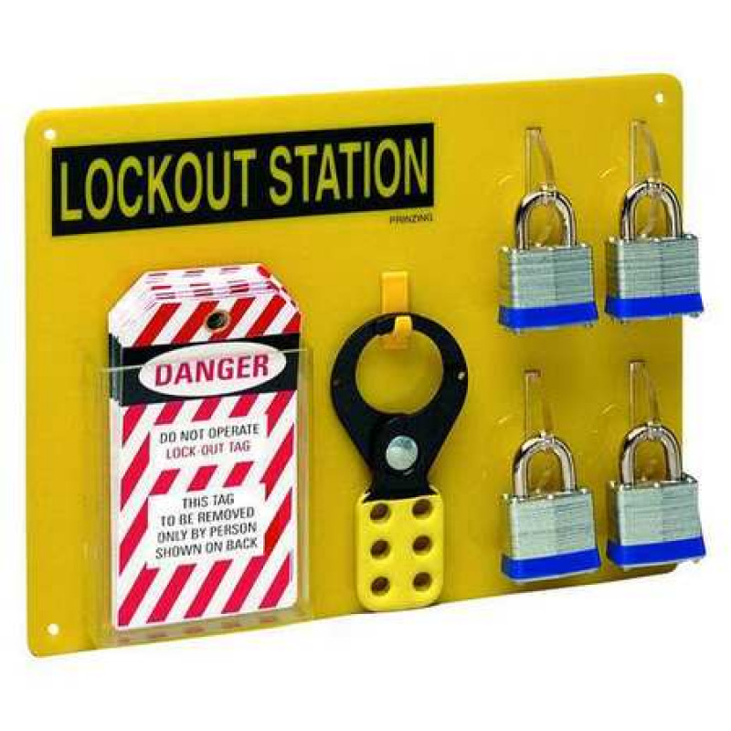 Lockout Station, Filled, Lockout Application General Lockout/Tagout, Number of Components 16, Number of Padlocks Included 4, Included Padlock Body Material Steel, Height 9 in, Width 12 in, Color Black/Yellow, Material Acrylic, Max. Number of Padlocks 4, Wall Mounting Yes, Portable No