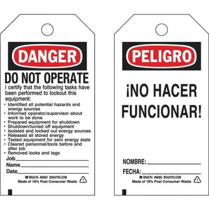 Lockout Tag, Material Polyester, Legend Do Not Operate I Certify That The Following Tasks, Height 5 3/4 in, Width 3 in, Withstand Pull Force 50 lb, Hole Size 3/8 in, Header Danger, Legend Color Black, Red, Background Color White, Legend Style Text, Write on Surface Yes