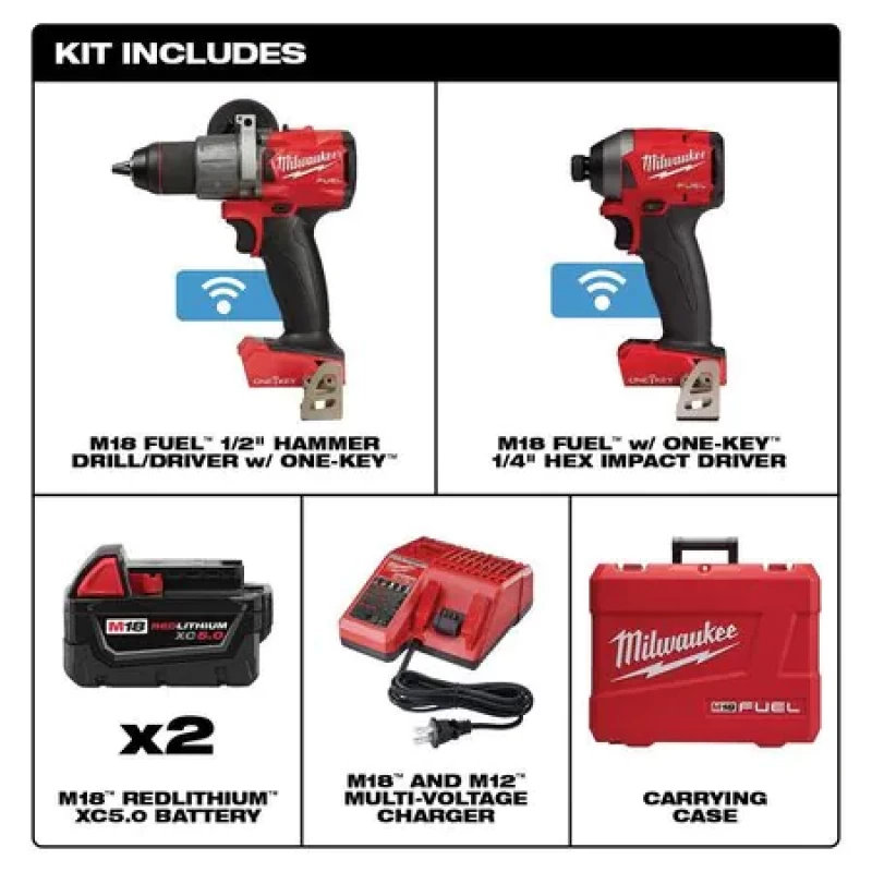 The M18™ FUEL™ 2-tool Combo kit with ONE-KEY™ is the highest performing hammer drill and impact driver in the industry with the added control of ONE-KEY™. The kit includes the M18™ FUEL™ 1/2 in. Hammer drill/driver w/ ONE-KEY™ (2806-20) that delivers up to 60% more power, up to 1.5 in. Shorter length and up to 2X faster speed under heavy load. At 1,200 in-lbs of torque and only 6.9 in. in length, it has the power for demanding applications and ability to access tight spaces. The hammer drill's anti-kickback technology increases control in bind-up situations and reduces unwanted shut-downs, with the added benefit of controlling sensitivity preferences. Also included is the M18™ FUEL™ 1/4 in. Impact driver w/ ONE-KEY™ (2857-20). It is the fastest, most compact, and most powerful impact driver in its class. With up to 2,000in-lbs of torque, it delivers up to 30% faster driving speed at only 4.59 in. in length, with up to 25% more power. The M18™ REDLITHIUM™ battery packs deliver more work per charge and more work over the life of the packs than competitors. Both tools are ONE-KEY™ compatible, allowing users to customize, track and manage their tool for increased productivity. Using the tool's tracking functionality, if ever lost or stolen, lock it out to protect your investment.
