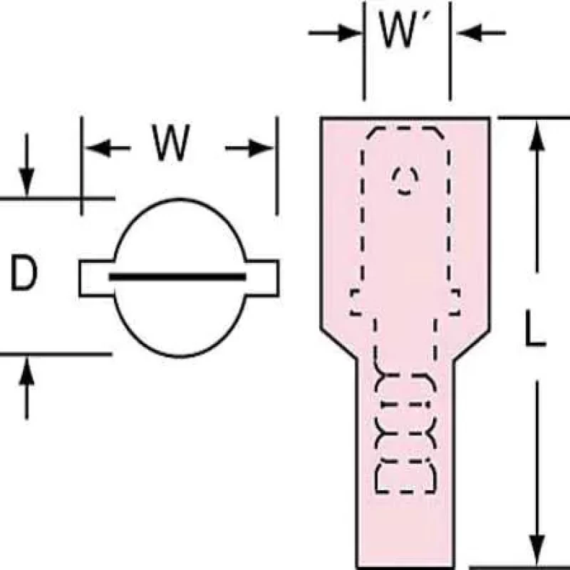 Male Disconnect, Insulation Full, Insulation Type Nylon, Insulation Color Red, Wire Range 22 to 18 AWG, Tab Size 0.020 in x 0.187 in, Barrel Inside Dia. 0.08 in, Max. Temp. 221 Degrees F, Max. Voltage 600 V, Overall Length 0.87 in, Seam Butted, Connection Material Tin-Plated Copper, Standards CSA Certified, RoHS Compliant, UL Listed, Connection Type Crimp, Package Quantity 1000