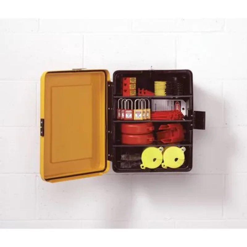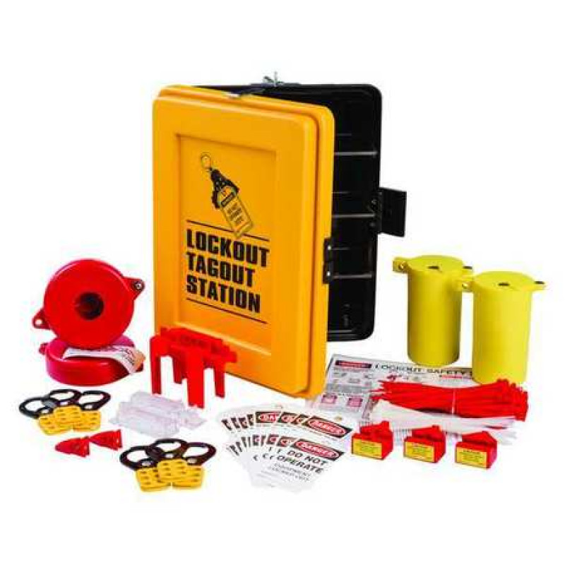 Lockout/Tagout Center, Filled, Lockout Application Electrical/Valve Lockout, Number of Components 97, Number of Padlocks Included 0, Height 17 1/8 in, Width 13 1/2 in, Depth 9 in, Color Red/White, Wall Mounting Yes, Portable No