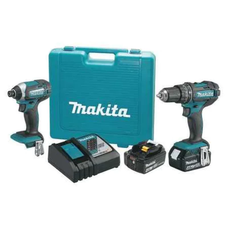Cordless Combination Kit, Cordless Tools Included Hammer Drill, Impact Driver, Voltage 18V DC, Power Source Cordless, Number of Tools 2, Battery Capacity (2) 4.0 Ah, Tool Brand Makita, Series 18V LXT, Battery Included Yes, Number of Batteries Included 2, Battery Model No. (2) Mfr. No. BL1840B, Battery Series 18V LXT, Charger Mfr. No. DC18RC, Charger Included Yes, Cordless Tool Kit Contents (2) Bare Tools, (2) Batteries, (1) Charger, Included Drills 1/2 in Hammer Drill (Compact, 28,500 BPM)