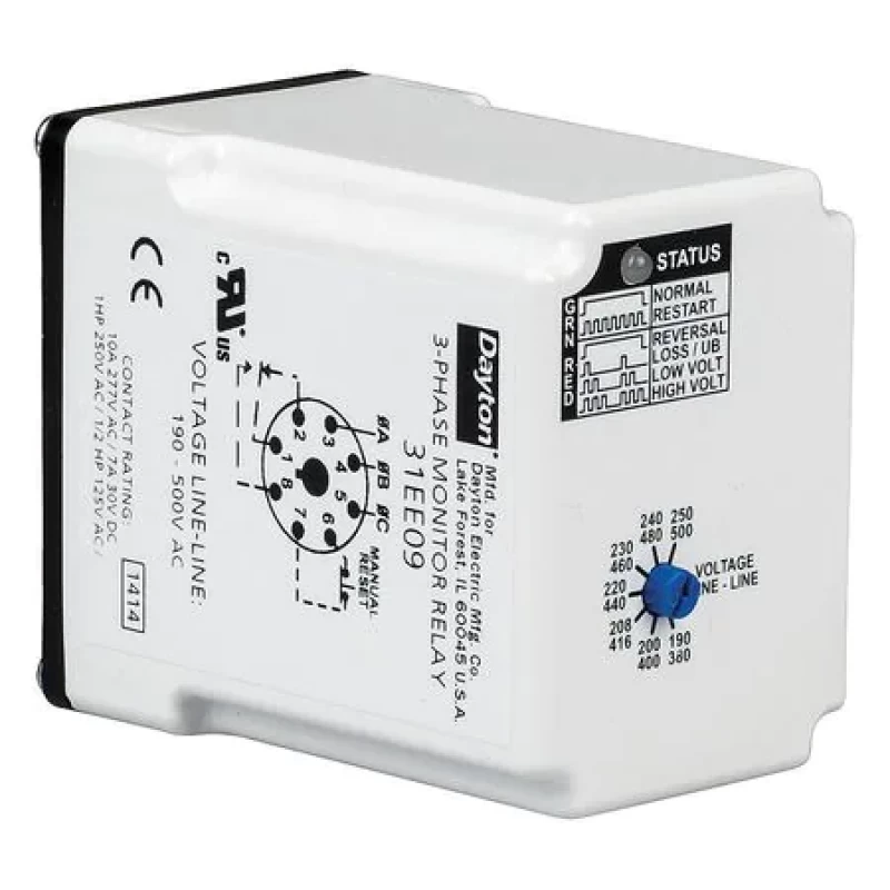Phase Monitor Relay, Input or Control Voltage 190 to 500V AC, AC Contact Rating - Relay 10A @ 277V, DC Contact Rating - Relay 7A @ 30V, Base Type - Plug In Relay Octal, Number of Pins - Relay 8, Mounting - Relay Plug In, Contact Form - Relay SPDT, Over Voltage Fixed 110 Percent of Line Voltage Setting, Under Voltage 171 to 450V AC, Phase Loss Sensitivity Yes, Phase Reversal Yes, Phase Unbalance Fixed 6 Percent, Restart Auto, Manual, Socket Code - Relay A