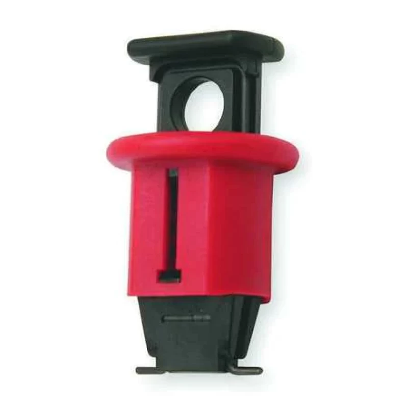 DIN Style Miniature Breaker Lockout, Pin-Out, Standard, Circuit Breaker Voltage 120/277, For Use With European Circuits on Machinery, Max. Number of Padlocks 1, Padlock Shackle Max. Dia. 9/32 in, Red, Height 1 in, Width 1 in, Length 9/16 in, Material Nylon