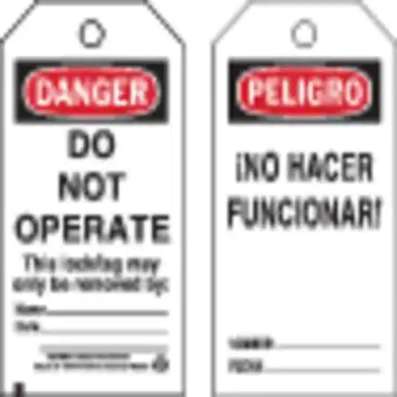 Danger Bilingual Tag, Material Polyester, Legend Do Not Operate This Lock/Tag May Only Be Removed By, Height 5 1/2 in, Width 3 in, Withstand Pull Force 50 lb, Hole Size 3/8 in, Header Danger, Legend Color Black, Background Color White, Legend Style Text, Write on Surface Yes