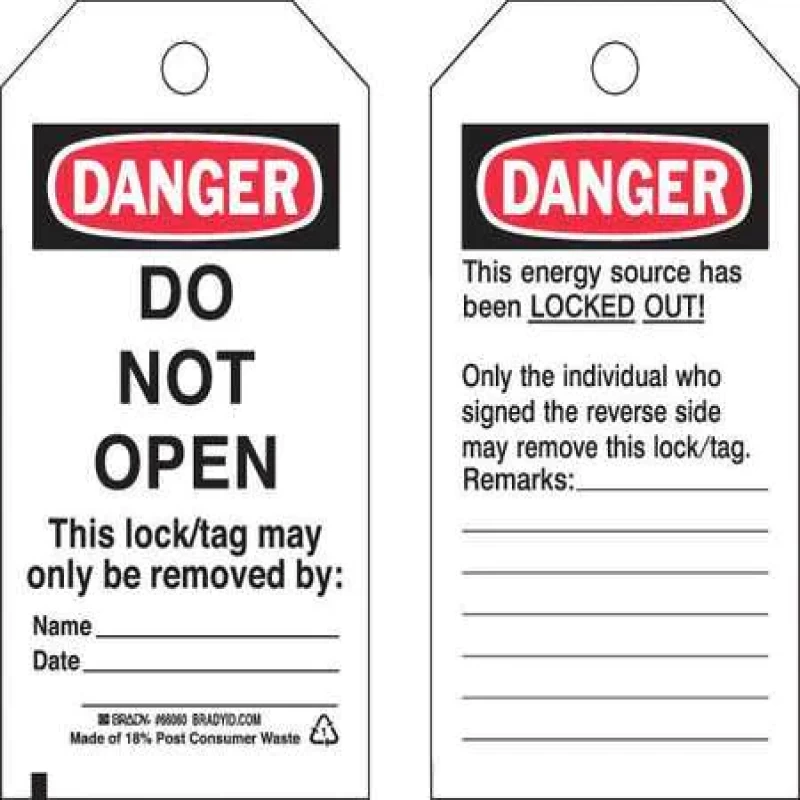 Danger Tag, Material Polyester, Legend Do Not Open This Lock/Tag May Only Be Removed By, Height 5 3/4 in, Width 3 in, Withstand Pull Force 50 lb, Hole Size 3/8 in, Header Danger, Legend Color Black, Background Color White, Legend Style Text, Write on Surface Yes