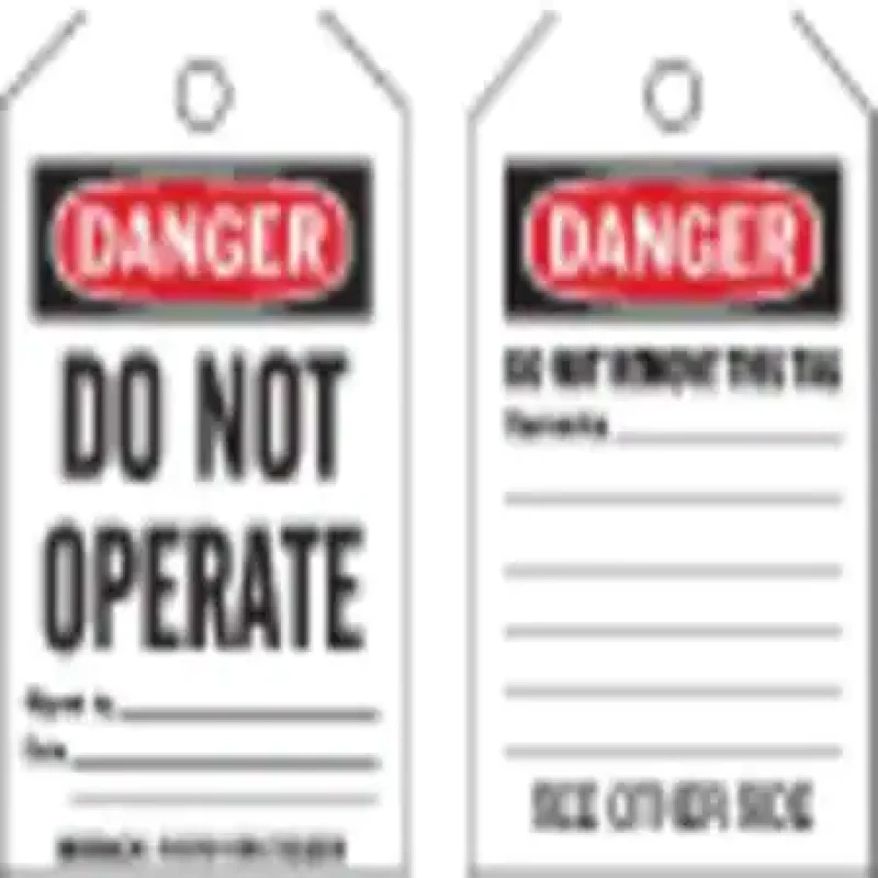 Danger Tag, Material Plastic, Legend Do Not Operate, Height 5 in, Width 3 in, Withstand Pull Force 50 lb, Hole Size 3/8 in, Header Danger, Legend Color Black, Background Color White, Legend Style Text, Write on Surface Yes