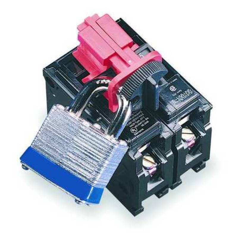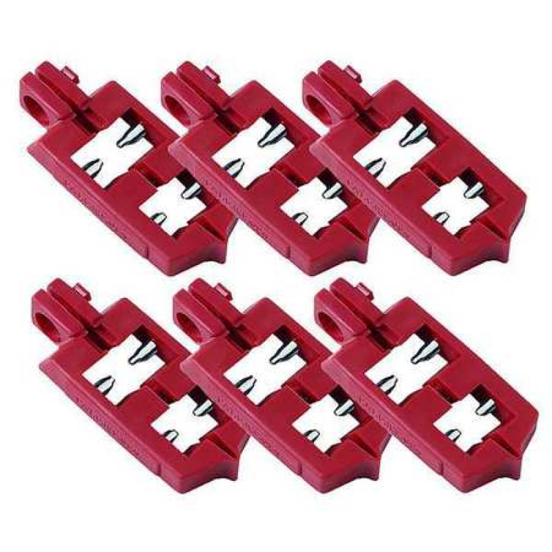 Multi-Pole Breaker Lockout, Clamp-On, Circuit Breaker Voltage 120/277, For Use With Breakers with Tie Bar, Max. Number of Padlocks 1, Padlock Shackle Max. Dia. 9/32 in, Red, Height 1 in, Width 3/4 in, Length 2 1/4 in, Material Nylon, Package Quantity 6