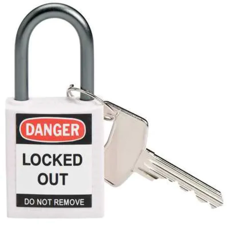 Lockout Padlock, Key Type Different, Body Material Thermoplastic, Shackle Dia. 13/64 in, Shackle Height 1 in, Shackle Material Aluminum, Shackle Width 3/4 in, Body Width 1 1/5 in, Body Thickness 5/8 in, Includes English, Spanish, French Lockout Labels, Standards OSHA 1910.147, Body Height 1 2/5 in, Body Color White, Shackle Type Open, Control Key Registration Required No