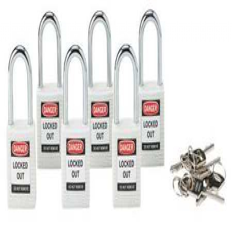Lockout Padlock, Key Type Different, Body Material Thermoplastic, Shackle Dia. 1/4 in, Shackle Height 1 1/2 in, Shackle Material Hardened Steel, Shackle Width 3/4 in, Body Width 1 1/2 in, Body Thickness 4/5 in, Includes English, Spanish, French Lockout Labels, Standards OSHA 1910.147, Body Height 1 3/4 in, Body Color White, Shackle Type Open, Control Key Registration Required No, Package Quantity 6