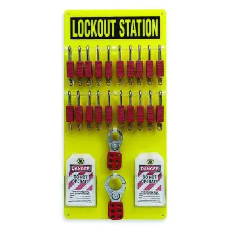 Lockout Station, Filled, Lockout Application General Lockout/Tagout, Number of Components 48, Number of Padlocks Included 20, Included Padlock Body Material Nylon, Height 23 1/2 in, Width 11 1/2 in, Depth 3/16 in, Color Yellow, Material Polycarbonate, Max. Number of Padlocks 20, Wall Mounting Yes, Portable No
