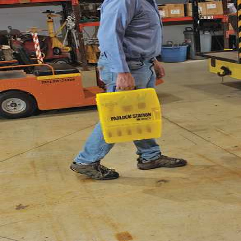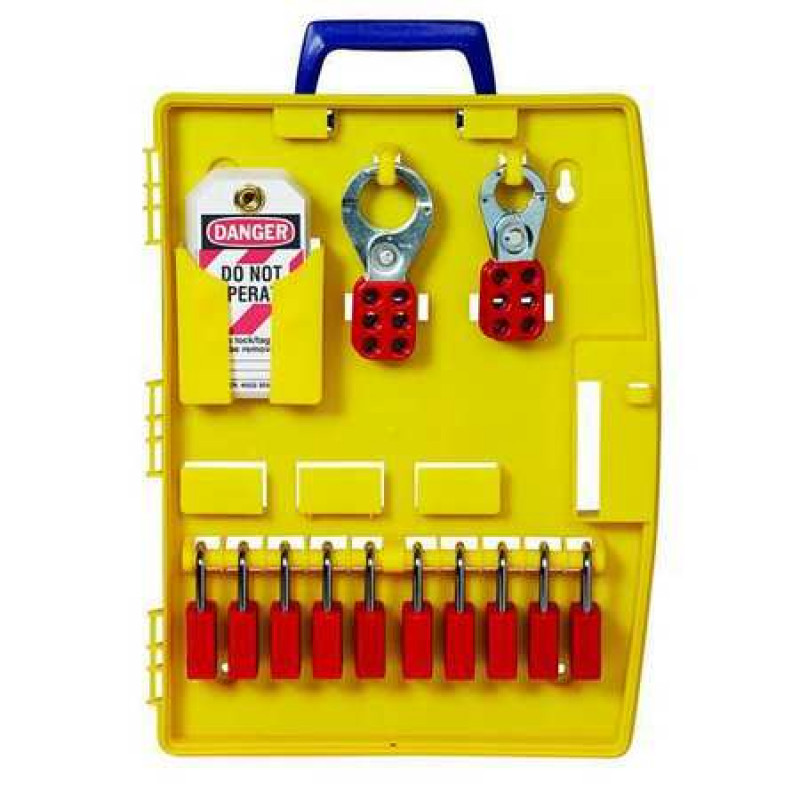 Lockout Station, Filled, Lockout Application General Lockout/Tagout, Number of Components 14, Number of Padlocks Included 5, Included Padlock Body Material Plastic, Height 17 in, Width 13 1/4 in, Depth 2 1/2 in, Color Yellow, Material Polypropylene, Max. Number of Padlocks 5, Wall Mounting Yes, Portable Yes