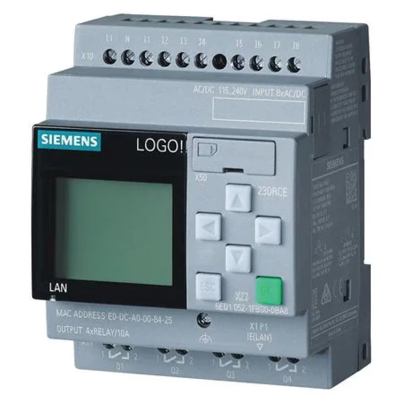 Logic Module, Input Voltage 115 to 230V DC/AC, Output Type Relay, 3 A, 10 A Amps, Number of Inputs 8 Digital, Number of Outputs 4, Yes Clock, Port Type Ethernet, MicroSD card, Data Log, Integrated Web Server, Modular Expandable, Older Projects Executable Cloud Connection in All Logo! 8.3 Basic Units, Soft Comfort V8.3 or Higher, User-Defined Web Pages, Depth 60 mm, Height 90 mm, Width 71.5 mm