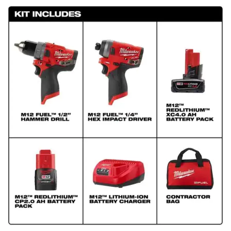 The 2598-22 M12 FUEL™ 2-tool Combo kit is the most capable and most compact 12 V hammer drill driver and impact driver Combo kit on the market. Included is the M12 FUEL™ drill driver (2503-20), the most capable, lightest weight and most compact 12 V hammer drill in the market. At only 6.6 in. and 2.8 lbs of weight it is the best hammer drill to use in compact spaces. It delivers the power to do a wide variety of applications at 1700 RPM’s and 350 in. lbs. Of torque. Also included, the M12 FUEL™ 1/4 in. hex impact (2553-20), the fastest driving speed, most compact with 4- mode drive control impact driver in the market. At 3,300 RPM the impact drives screws over 20% faster than competitors. At 5.1 in. in length it allows for unmatched access in tight spaces. The 4-mode drive control provides greater control over output speed and power for greater versatility by delivering 0-1, 300 RPM in mode 1, 0-2, 400 RPM in mode 2 and 0-3, 300 RPM in mode 3. Mode 4 is self-tapping screw mode which is designed to reduce walking when starting self-tapping screws as well as reduce overdriving, breaking and stripping out screws.