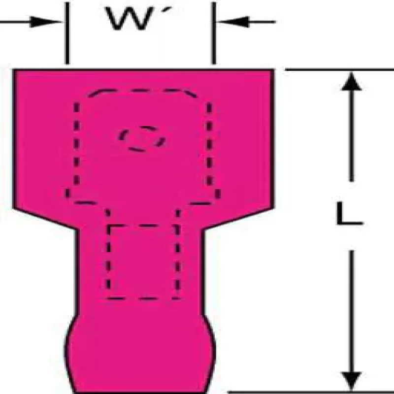 Item: Male DisconnectInsulation: FullInsulation Color: RedWire Range: 22 to 18 AWGInsulation Type: NylonConnection Type: CrimpTab Size: 0.032 in x 0.250 inOverall Length: 0.95 inSeam: ButtedMax. Voltage: 600 VMax. Temp.: 221 Degrees FConnection Material: Tin-Plated Copper