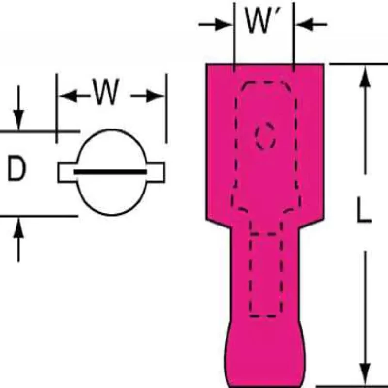 Male Disconnect, Insulation Full, Insulation Type Nylon, Insulation Color Red, Wire Range 22 to 18 AWG, Tab Size 0.020 in x 0.187 in, Barrel Inside Dia. 0.08 in, Max. Temp. 221 Degrees F, Max. Voltage 600 V, Overall Length 0.87 in, Seam Butted, Connection Material Tin-Plated Copper, Standards CSA Certified, RoHS Compliant, UL Listed, Connection Type Crimp, Package Quantity 1000