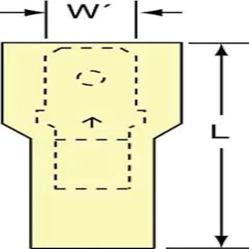 Male Disconnect, Insulation Full, Insulation Type Nylon, Insulation Color Yellow, Wire Range 12 to 10 AWG, Tab Size 0.032 in x 0.250 in, Barrel Inside Dia. 0.15 in, Max. Temp. 221 Degrees F, Max. Voltage 600 V, Overall Length 1.05 in, Seam Butted, Connection Material Tin-Plated Copper, Standards CSA Certified, RoHS Compliant, UL Listed, Connection Type Crimp, Package Quantity 500