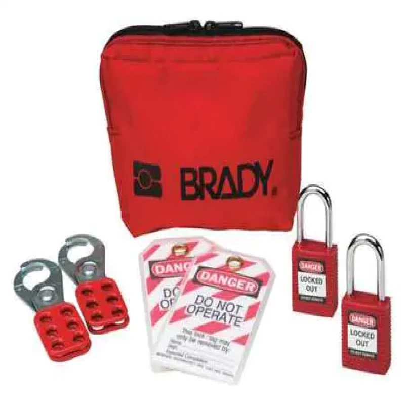 Includes: (2) Heavy Duty Lockout Tags (66520), (1) 1 in Lockout Hasp (65375), (1) 1.5 in Lockout Hasp (65276), (1) Lockout Belt Pouch (51172), (2) Brady Safety Padlocks (99552)