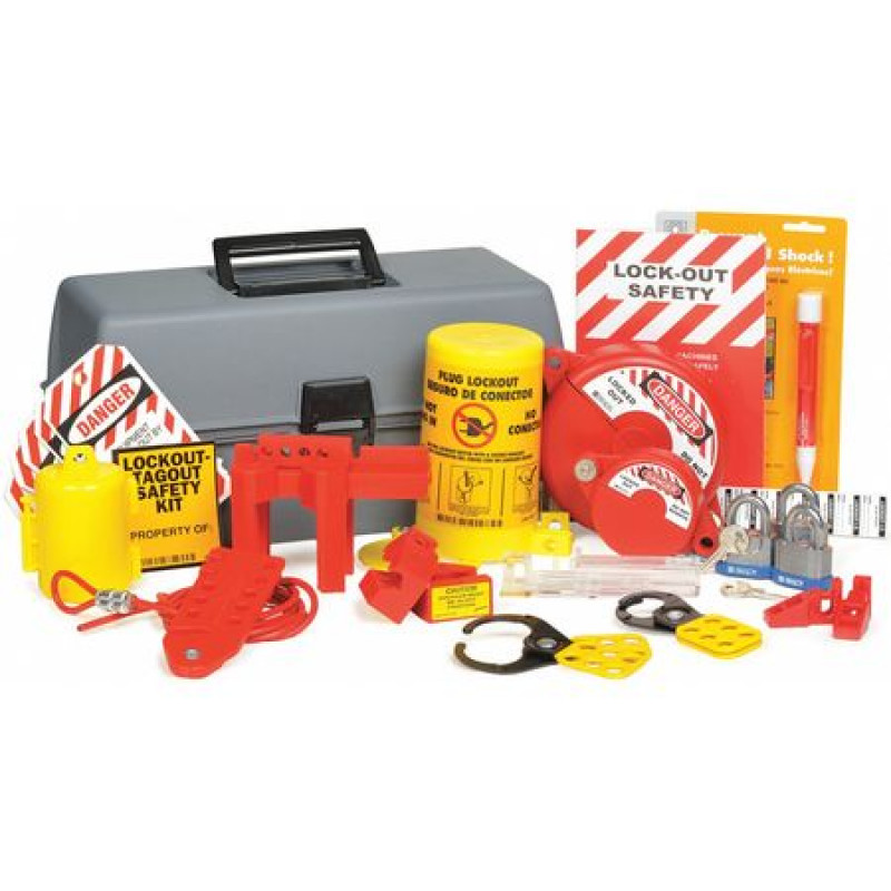 - Includes: (3) Blue Bumper Steel Padlocks, (1) Ball Valve Lockout, (1) Small Plug Lockout, (1) 1 in Steel Jaw dia Hasp, (1) 1-1/2 in Steel Jaw dia Hasp, (1) 1 to 2-1/2 in Adjustable Valve Lockout, (1) 2-1/2-5 in Adjustable Ball Valve Lockout, (1) Cable Lockout, (1) Wall Switch Lockout, (1) AC Voltage Detector Pen, (1) Large Electrical Plug Lockout, (2) No-Hole Pole Breaker Lockouts, (2) Multiple Breaker Lockouts, (1) Training Booklet, (14) Padlock Labels, (10) Tags, (10) Ties