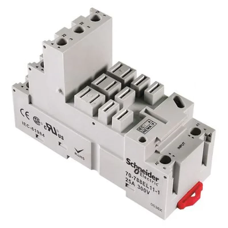 Relay Socket, Socket Type - Relay Elevator, Finger Safe, Base Style - Relay Socket Square, Number of Pins - Relay 11, Contact Form - Relay Socket 3PDT, Contact Rating - Relay Socket 25A @ 300V AC, Mounting - Relay DIN Rail, Socket Code - Relay C, Electrical Connection - Relay Socket Screw Clamp, Height - Relay Socket 2.48 in, Width - Relay Socket 1.4 in, Depth - Relay Socket 3.7 in, Status Indicator None, Color White, Standards CE, CSA, RoHS, UL Recognized