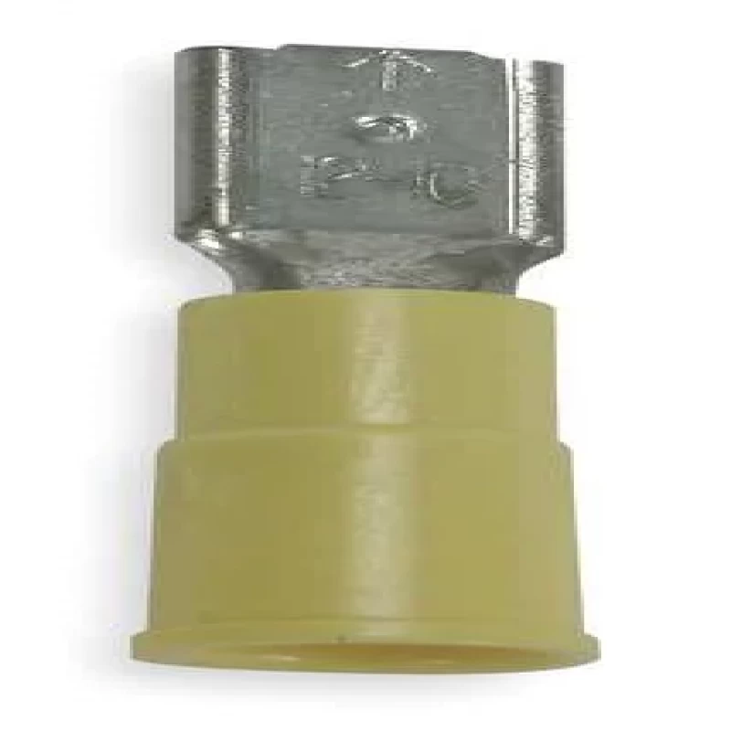 Female Disconnect, Insulation Full, Insulation Type Nylon, Insulation Color Yellow, Wire Range 12 to 10 AWG, Tab Size 0.032 in x 0.250 in, Barrel Inside Dia. 0.128 in, Max. Temp. 221 Degrees F, Max. Voltage 600 V, Overall Length 0.99 in, Seam Butted, Connection Material Tin-Plated Copper, Standards CSA Certified, RoHS Compliant, UL Listed, Connection Type Crimp, Package Quantity 50