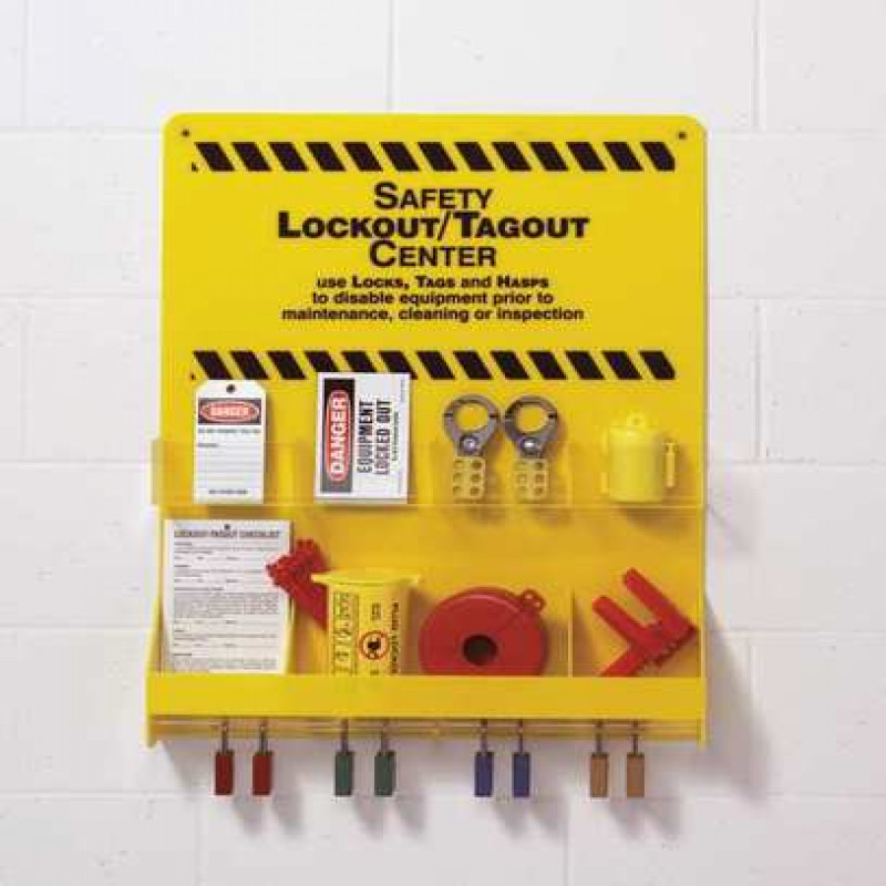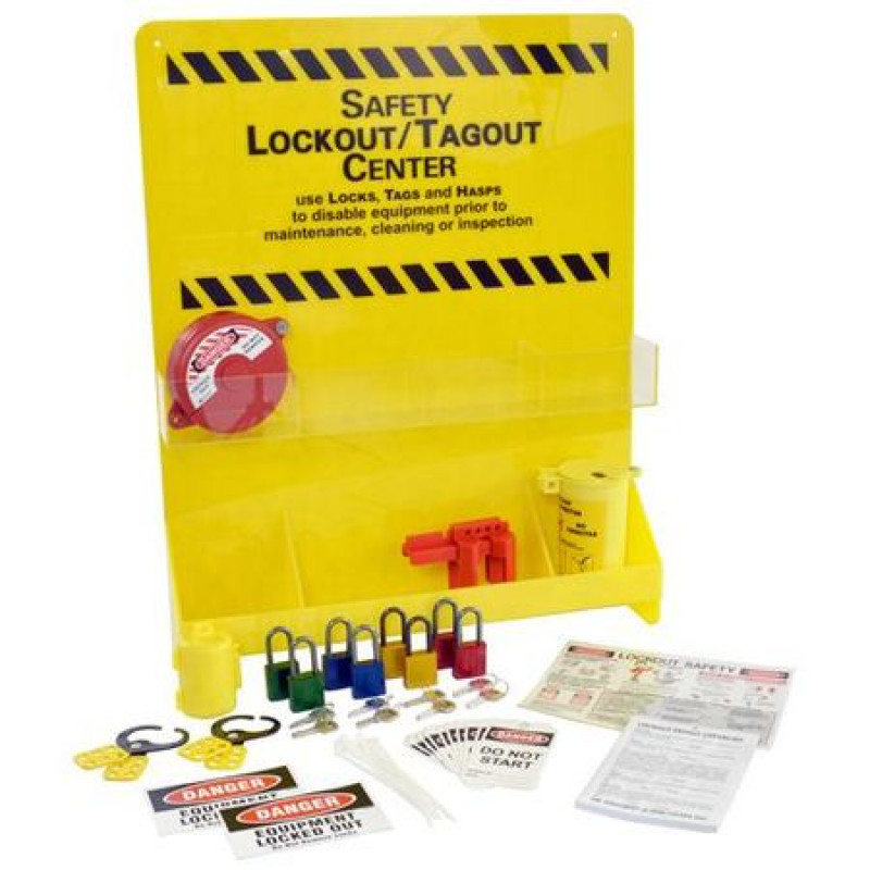 Lockout/Tagout Center, Filled, Lockout Application Electrical/Valve Lockout, Number of Components 102, Number of Padlocks Included 8, Included Padlock Body Material Aluminum, Height 29 in, Width 23 7/8 in, Depth 4 3/8 in, Color Black/Yellow, Material Acrylic, Max. Number of Padlocks 8, Wall Mounting Yes, Portable No