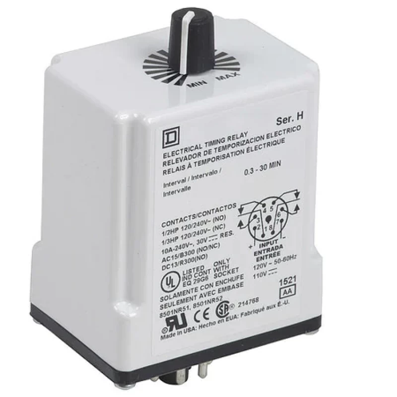 Time Delay Relay, Function - Timing Relay Interval, Coil Volts 110V DC, 120V AC, AC Contact Rating - Relay 10A @ 240V, Base Type - Plug In Relay Octal, Number of Pins - Relay 8, Mounting - Relay Plug In, Contact Form - Relay DPDT, Power Consumption - Relay 2.0 VA, Adjustment Method - Timer Rotary Knob, Socket Code - Relay A, Status Indicator None, Contact Material Silver Nickel
