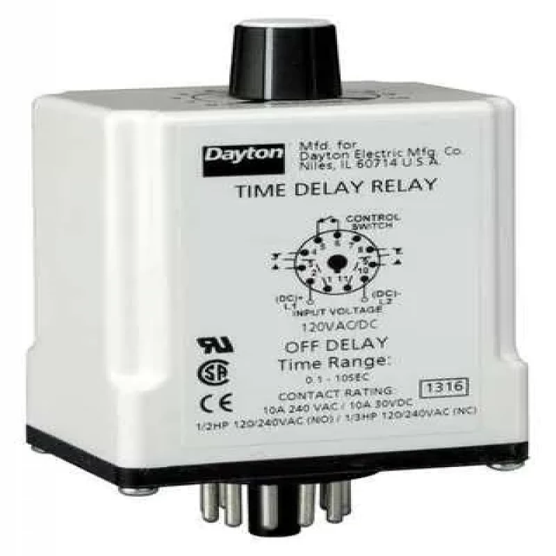 Single Function Time Delay Relay, Function - Timing Relay Off Delay, Coil Volts 120V AC/DC, AC Contact Rating - Relay 10A @ 240V, DC Contact Rating - Relay 10A @ 30V, Base Type - Plug In Relay Octal, Number of Pins - Relay 11, Mounting - Relay Plug In, Contact Form - Relay DPDT, Power Consumption - Relay 2.0 W, 2.5 VA, Adjustment Method - Timer Potentiometer, Min. Time Setting - Timer 1.8 sec, Max. Time Setting - Timer 3 min, Status Indicator None, Contact Material Silver Nickel