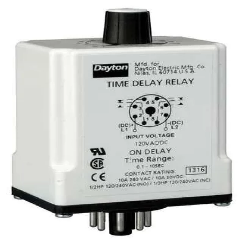 Single Function Time Delay Relay, Function - Timing Relay On Delay, Coil Volts 120V AC/DC, AC Contact Rating - Relay 10A @ 240V, DC Contact Rating - Relay 10A @ 30V, Base Type - Plug In Relay Octal, Number of Pins - Relay 8, Mounting - Relay Plug In, Contact Form - Relay DPDT, Power Consumption - Relay 2.0 W, 2.5 VA, Adjustment Method - Timer Potentiometer, Min. Time Setting - Timer 1.8 sec, Max. Time Setting - Timer 3 min, Status Indicator None, Contact Material Silver Nickel