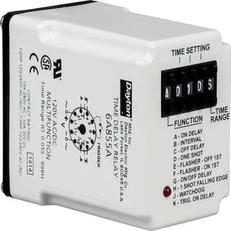 Multi-Function Time Delay Relay, Function - Timing Relay Flasher (Off First), Flasher (On First), Interval On, Off Delay, Off/On Delay, On Delay, One Shot, Single Shot Falling Edge, Triggered On Delay, Watchdog, Coil Volts 12V DC, AC Contact Rating - Relay 10A @ 240V, DC Contact Rating - Relay 10A @ 30V, Base Type - Plug In Relay Octal, Number of Pins - Relay 11, Mounting - Relay Plug In, Contact Form - Relay DPDT, Power Consumption - Relay 3.0 W