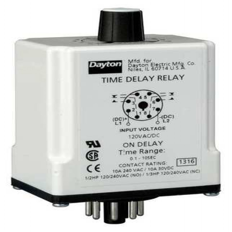 Single Function Time Delay Relay, Function - Timing Relay On Delay, Coil Volts 120V AC/DC, AC Contact Rating - Relay 10A @ 240V, DC Contact Rating - Relay 10A @ 30V, Base Type - Plug In Relay Octal, Number of Pins - Relay 8, Mounting - Relay Plug In, Contact Form - Relay DPDT, Power Consumption - Relay 2.0 W, 2.5 VA, Adjustment Method - Timer Potentiometer, Min. Time Setting - Timer 0.01 sec, Max. Time Setting - Timer 1 sec, Status Indicator None, Contact Material Silver Nickel