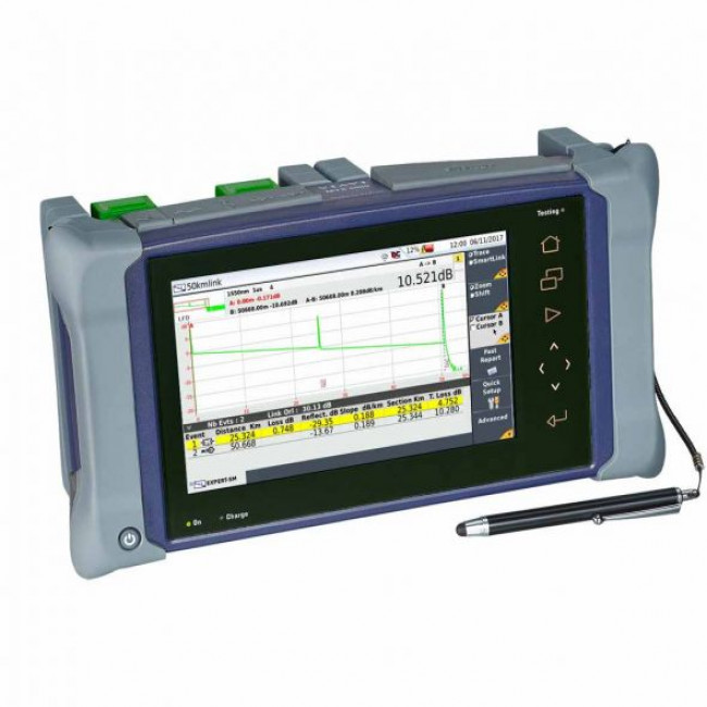 • An easy-to-use solution with intuitive icon-based graphical user interface (GUI) and multi-touch screen requiring minimal training. A compact platform with field-replaceable modules covering multiple optical test functions (OTDRs, optical power & loss testing, Optical Spectrum Analyzer (OSA), etc…) that enable complete optical network qualification.