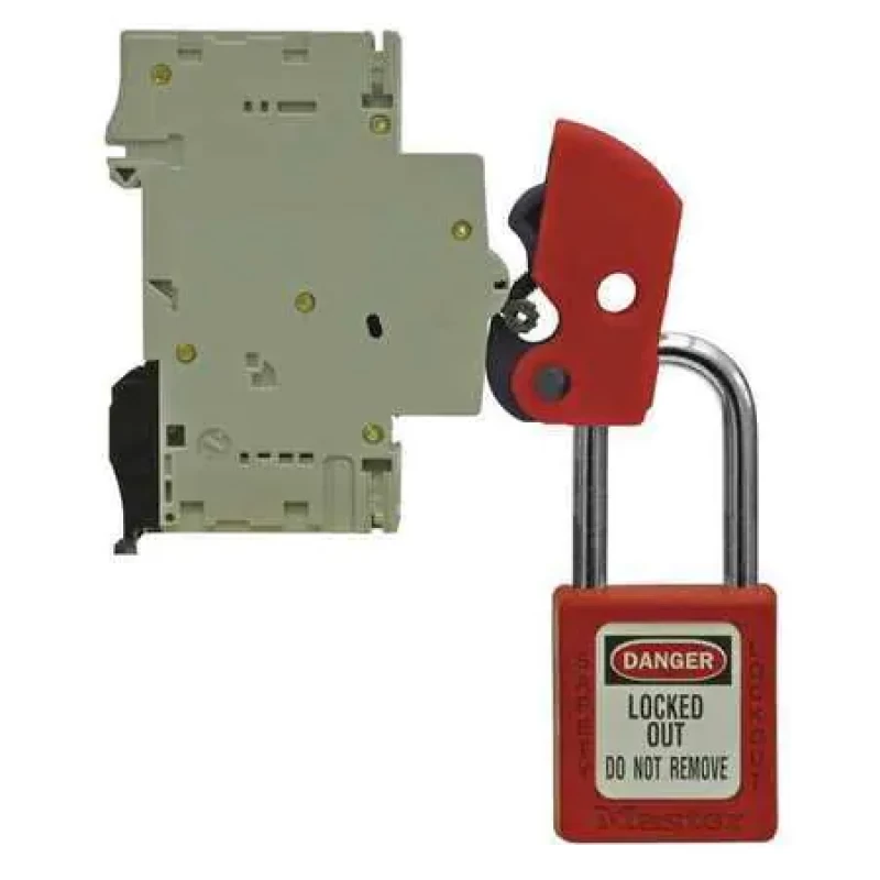 ISO-DIN Universal Lockout Device, Clamp-On with Screw, Circuit Breaker Voltage 120/277, For Use With Master Lock and American Lock Padlocks, Max. Number of Padlocks 1, Padlock Shackle Max. Dia. 9/32 in, Black, Red, Height 1 3/16 in, Width 11/16 in, Length 2 5/64 in, Material PBT, Stainless Steel, Thermoplastic