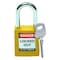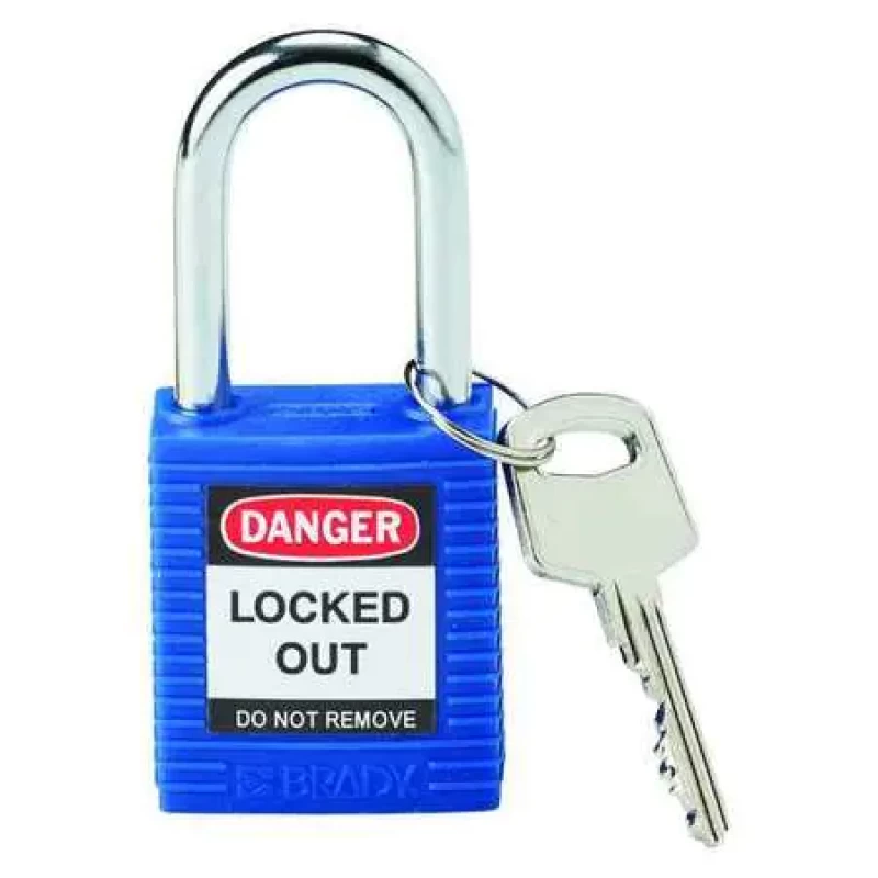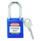 Lockout Padlock, Key Type Different, Body Material Thermoplastic, Shackle Dia. 1/4 in, Shackle Height 1 1/2 in, Shackle Material Hardened Steel, Shackle Width 3/4 in, Body Width 1 1/2 in, Legend Danger Locked Out Do Not Remove, Includes (3) Lockout Labels, Standards OSHA 1910.147, Body Height 1 3/4 in, Body Color Blue, Shackle Type Open