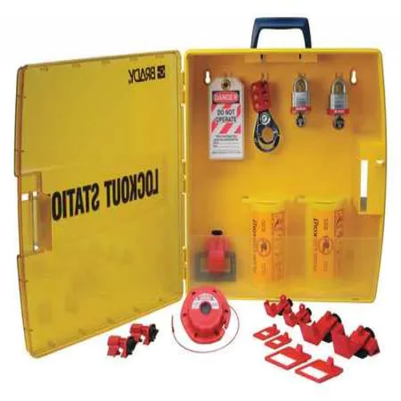 Lockout Station, Filled, Lockout Application Electrical Lockout, Number of Components 26, Number of Padlocks Included 6, Included Padlock Body Material Steel, Height 17 in, Width 17 in, Depth 6 3/4, Color Yellow, Material Polypropylene, Wall Mounting Yes, Portable Yes