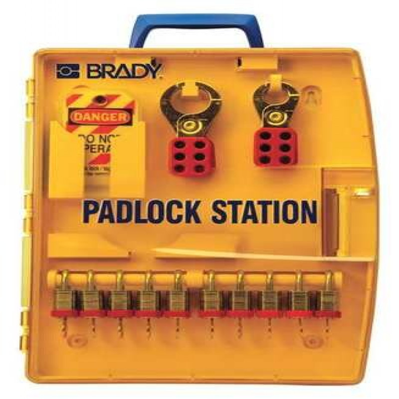 Lockout Station, Filled, Lockout Application General Lockout/Tagout, Number of Components 27, Number of Padlocks Included 10, Included Padlock Body Material Steel, Height 17 in, Width 13 1/4 in, Depth 2 1/2 in, Color Yellow, Material Polypropylene, Wall Mounting Yes, Portable Yes