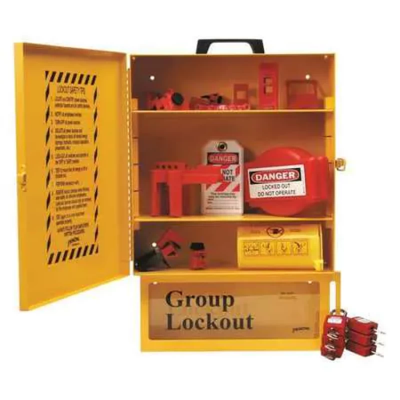 Lockout Station, Filled, Lockout Application Electrical Lockout, Number of Components 30, Number of Padlocks Included 6, Included Padlock Body Material Plastic, Height 16 in, Width 14 in, Depth 6 in, Color Black/Yellow, Material Metal, Max. Number of Padlocks 10, Wall Mounting Yes, Portable Yes