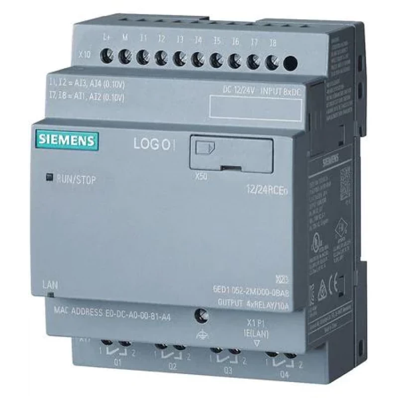 Logic Module, Input Voltage 12 to 24V DC, Output Type Relay, 10 A Amps, Number of Inputs 4 Analog, 8, Number of Outputs 4, Yes Clock, None Display, Port Type Ethernet, MicroSD card, Data Log, Integrated Web Server, Modular Expandable, Older Projects Executable Cloud Connection in All Logo! 8.3 Basic Units, Soft Comfort V8.3 or Higher, User-Defined Web Pages, Depth 60 mm, Height 90 mm, Width 71.5 mm