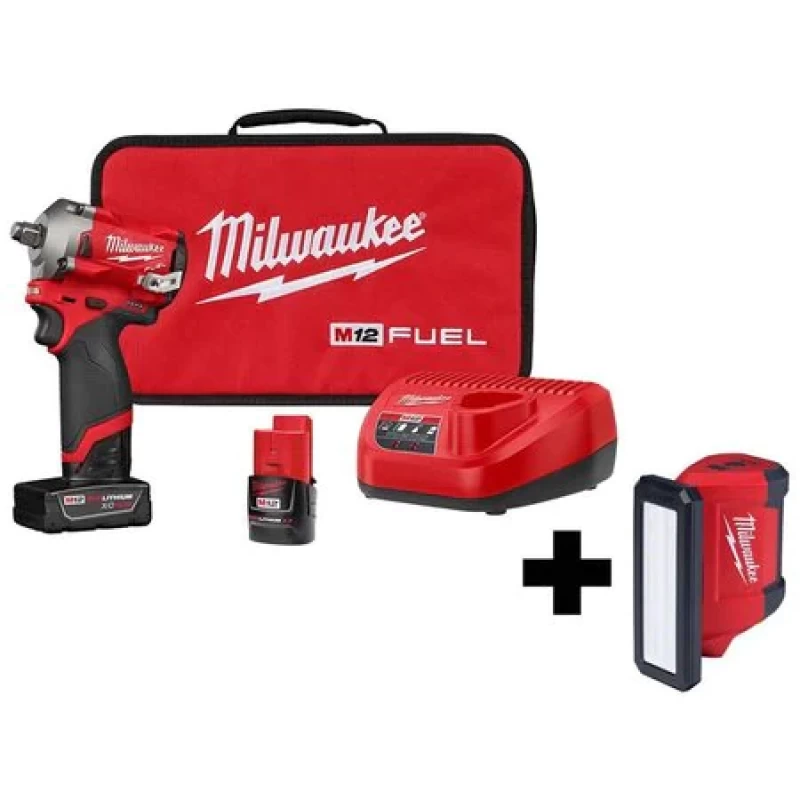 The M12™ FUEL™ 1/2 in. Stubby impact wrench is the industries most Compact Impact Wrench on the market place. Measuring only 4.9 in. in length, this tool fits in tighter spaces, making users more productive. Increased torque delivers an industry leading 250 ft-lbs of breakaway torque, removing even the most stubborn bolts and fasteners. 4-Mode drive control, will allow unmatched control in various fastening applications. 1 to 3 RPM allows for precision control, and auto-shut off mode in the 4th setting will prevent over-fastening of bolts while doing reassembly work. & The MILWAUKEE® M12™ Rover™ Mounting Flood Light provides the ultimate flood light for on the go use, take the light anywhere and hang it everywhere. The floodlight adapts, performs, and survives to any work environment with strong magnets, spring loaded clamp, keyhole hanger, and wire hanger for use in virtually any workspace. The 1,000 lumens of TRUEVIEW™ High Definition Output are capable of lighting up large workspaces. ROVER™ Flood Lights are built to go anywhere and withstand anything.