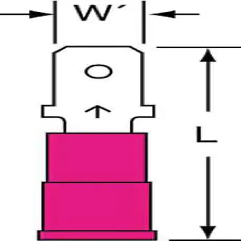 Male Disconnect, Insulation Full, Insulation Type Nylon, Insulation Color Red, Wire Range 22 to 18 AWG, Tab Size 0.020 in x 0.187 in, Barrel Inside Dia. 0.08 in, Max. Temp. 221 Degrees F, Max. Voltage 600 V, Overall Length 0.84 in, Seam Brazed, Connection Material Tin-Plated Brass, Standards CSA Certified, RoHS Compliant, UL Listed, Connection Type Crimp, Package Quantity 1000