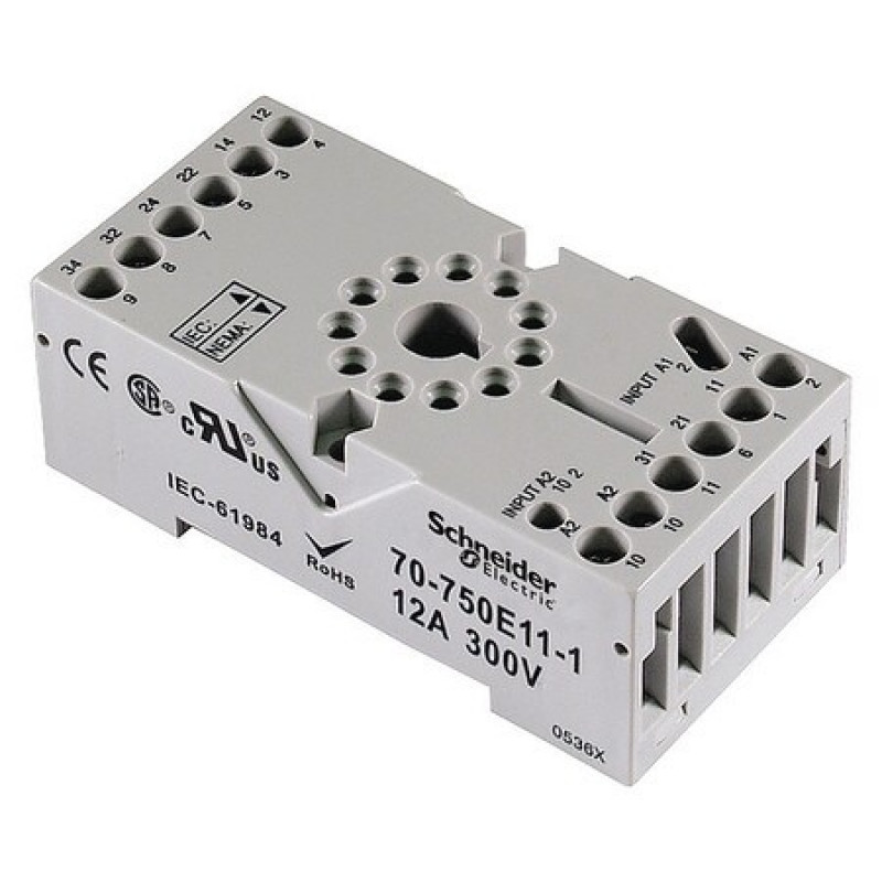 Relay Socket, Socket Type - Relay Finger Safe, Standard, Base Style - Relay Socket Octal, Number of Pins - Relay 11, Contact Form - Relay Socket 3PDT, Contact Rating - Relay Socket 12A @ 300V AC, Mounting - Relay DIN Rail, Socket Code - Relay B, Electrical Connection - Relay Socket Screw Clamp, Height - Relay Socket 1.06 in, Width - Relay Socket 1.49 in, Depth - Relay Socket 2.95 in, Status Indicator None, Color White, Standards CE, CSA, RoHS, UL Recognized