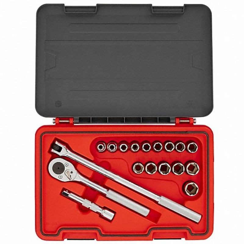 Metric socket sets come with drive tools and an assortment of sockets for a range of fastener sizes. They come in sizes that are measured in millimeters to fit fasteners with a metric size head.